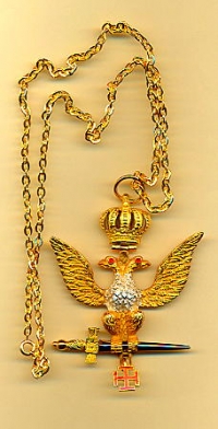 33rd Degree Eagle with Red swinging Teutonic Cross fitted to Jewel and suspended from 21" medium weight chain.